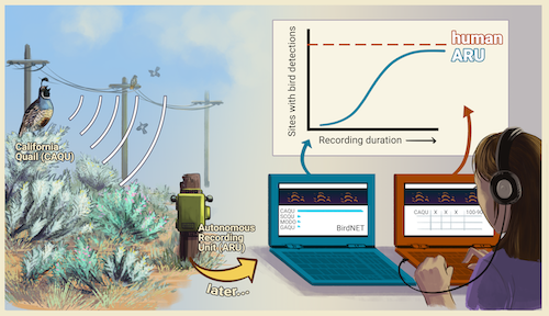 - ARUs can sample for hundreds of hours per point. We have found that ARUs will often detect rare (or rarely vocalizing) species that are sometimes missed by a small number of in-person visits.