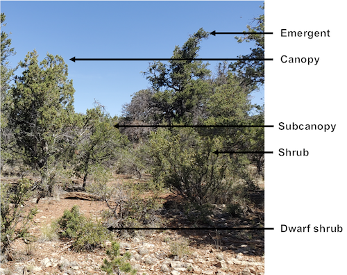 Figure from Jones et al 2025. The photo represents persistent pinyon-juniper woodland habitat at Grand Canyon National Park, with each foliage layer denoted by an arrow.