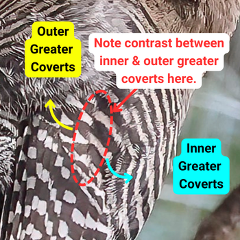 Notice that the outer 2-3 visible greater coverts, above the secondaries and below the overlaying flank feathers, have a slightly different pattern than the inner coverts to the right of these. As in Northern Flickers, the bars are more triangular in shape, not straight across, and these greater coverts also appear more bleached and worn, indicating retained juvenile feathers, contrasting with fresher and more horizontally barred, formative inner greater coverts, and confirming this as an FCF (SY) in February 2024. So, yes, along with location and sex, we can add age as a supporting factor in concluding that this almost assuredly is the same bird, returning for three winters in a row, but having been missed during the second winter. And, yes, it is much better to assume that this vagrant female WISA returned to winter at this same odd and unlikely location, than two female WISAs choosing to do this in different years.