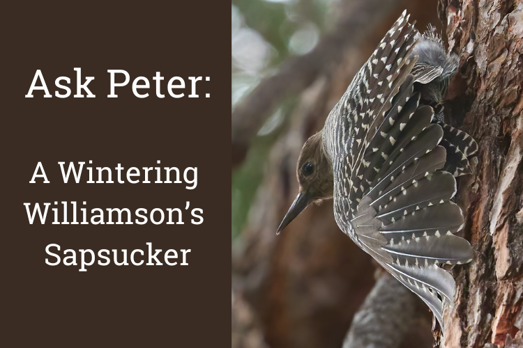 A question from Pete Dunten is the subject of this Ask Peter column: "We have a wintering female Williamson's Sapsucker in Santa Clara county, at the same odd location (trees growing in a narrow median strip of a busy road) as a female present here during the winter of 2023-2024. She's hard to spot and could easily have been missed during the winter of 2024-2025. Anyway, someone got excellent photos (eBird Checklist) and if you enjoy this sort of thing, I'd love to know her age."