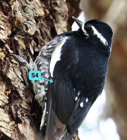 Finally, I couldn't help myself, what of the male in February 2023? Show me a photo, any photo, of any bird, and I immediately try to age it (often before I even care to identify the species). Among the 12 referenced images is the one below, taken exactly one year earlier than the female above. WISAs are unique among our woodpeckers (and maybe among all of the world's woodpeckers) in having very diagnostic sex-specific plumages, beginning even as nestlings. Because they are such non-conformists among Picadae, they were thought by early ornithologists in the mid-1800s to be two different species (see here for the story). So, although the look is quite different, this male also shows uniform wing feathers, except, if you look closely, the s4 is a worn juvenile feather! So, yes, another TCB (TY) in February, even though we cannot see the primary coverts.