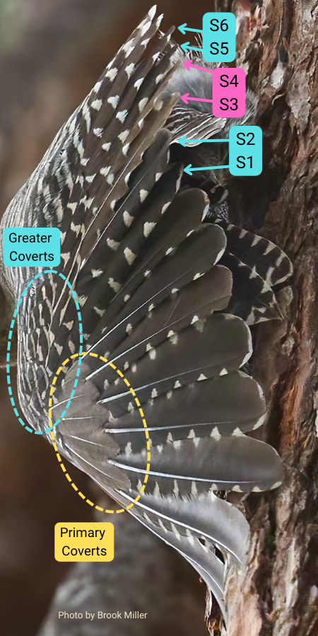 Finally, I couldn't help myself, what of the male in February 2023? Show me a photo, any photo, of any bird, and I immediately try to age it (often before I even care to identify the species). Among the 12 referenced images is the one below, taken exactly one year earlier than the female above. WISAs are unique among our woodpeckers (and maybe among all of the world's woodpeckers) in having very diagnostic sex-specific plumages, beginning even as nestlings. Because they are such non-conformists among Picadae, they were thought by early ornithologists in the mid-1800s to be two different species (see here for the story). So, although the look is quite different, this male also shows uniform wing feathers, except, if you look closely, the s4 is a worn juvenile feather! So, yes, another TCB (TY) in February, even though we cannot see the primary coverts.